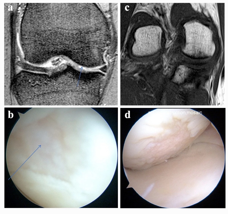 上圖:核磁共振下看到輕微的軟骨缺損,但做關節鏡下,卻看到軟骨已經是第四期的破裂變化.
